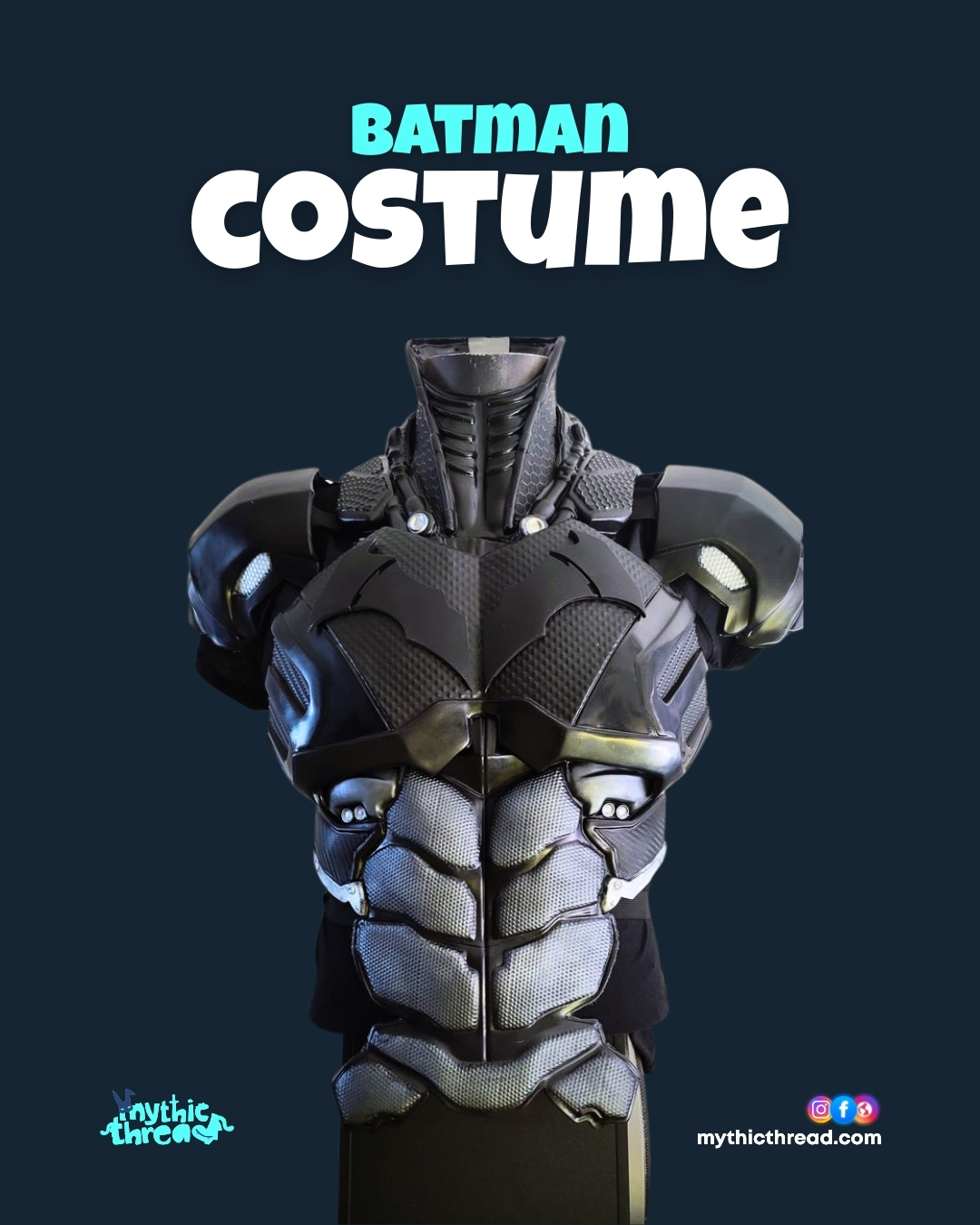 Advanced Tactical Engineering & Detail We use premium, high-impact materials to create a heavy-duty, multi-layered look without compromising your mobility. The suit features a signature reinforced chest piece with an integrated bat emblem, hex-patterned abdominal plating, and detailed shoulder pauldrons. Every panel is finished in a specialized matte-black coating with textured accents to ensure a screen-accurate, cinematic look that disappears into the shadows.